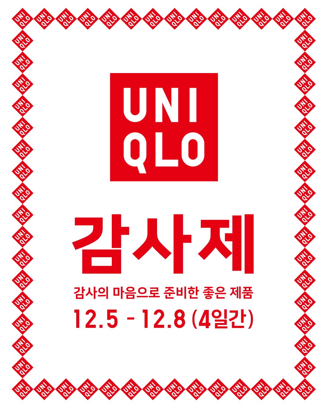 12월 5일 금요일, 오늘부터 유니클로 감사제가 시작됩니다. 단 4일 동안만 할인 가격으로 선보이는 아이템들을 만나볼 수 있는데요. 점점 추워지는 날씨에 꼭 필요한 히트텍과 플리스 등 다양한 겨울 제품을 할인된 가격으로 만나볼 수 있습니다. 자세한 제품군은 유니클로 앱에서 확인할 수 있으며, 올겨울을 따뜻하게 만들어 줄 아이템들을 득템해보세요!